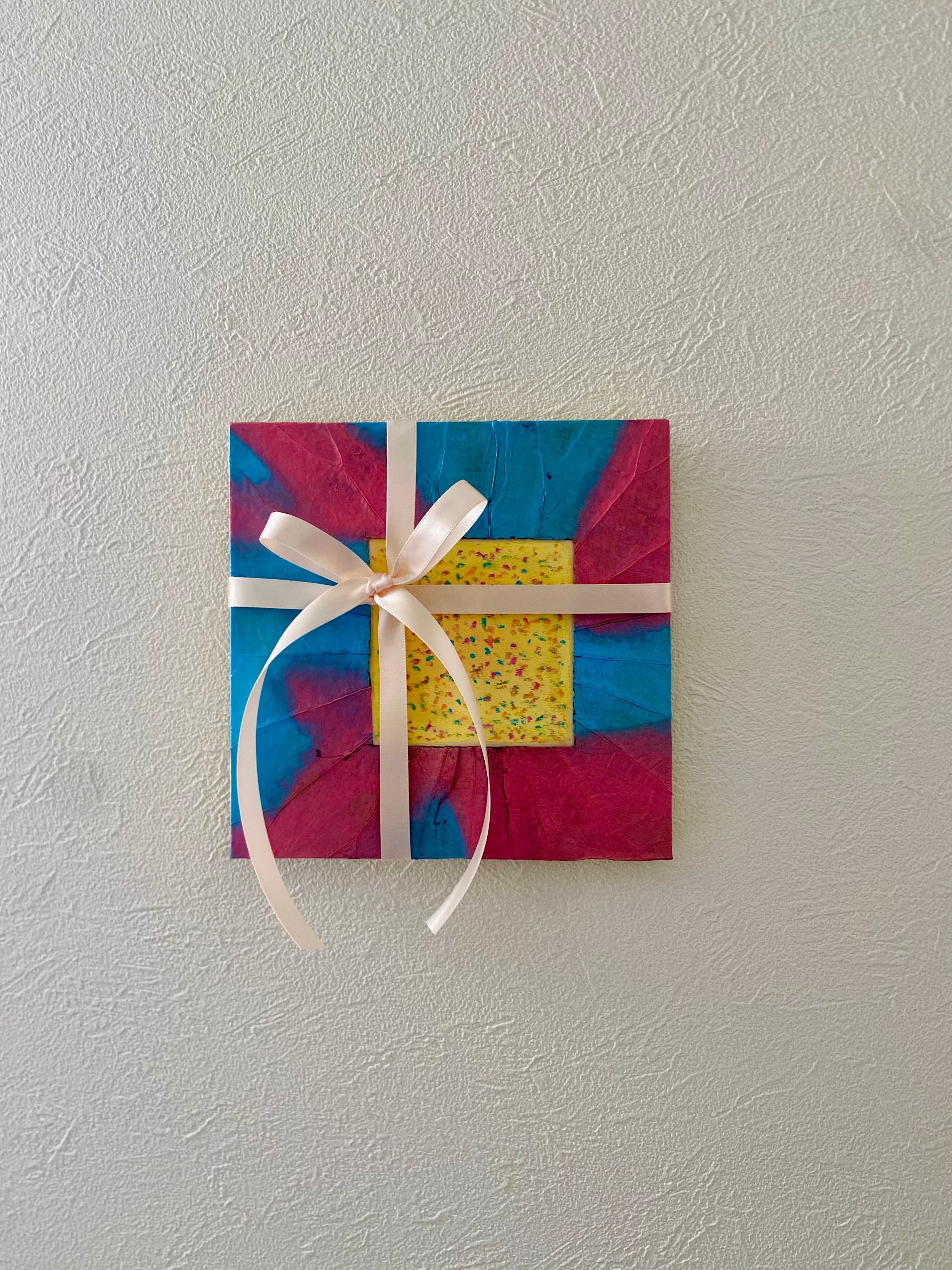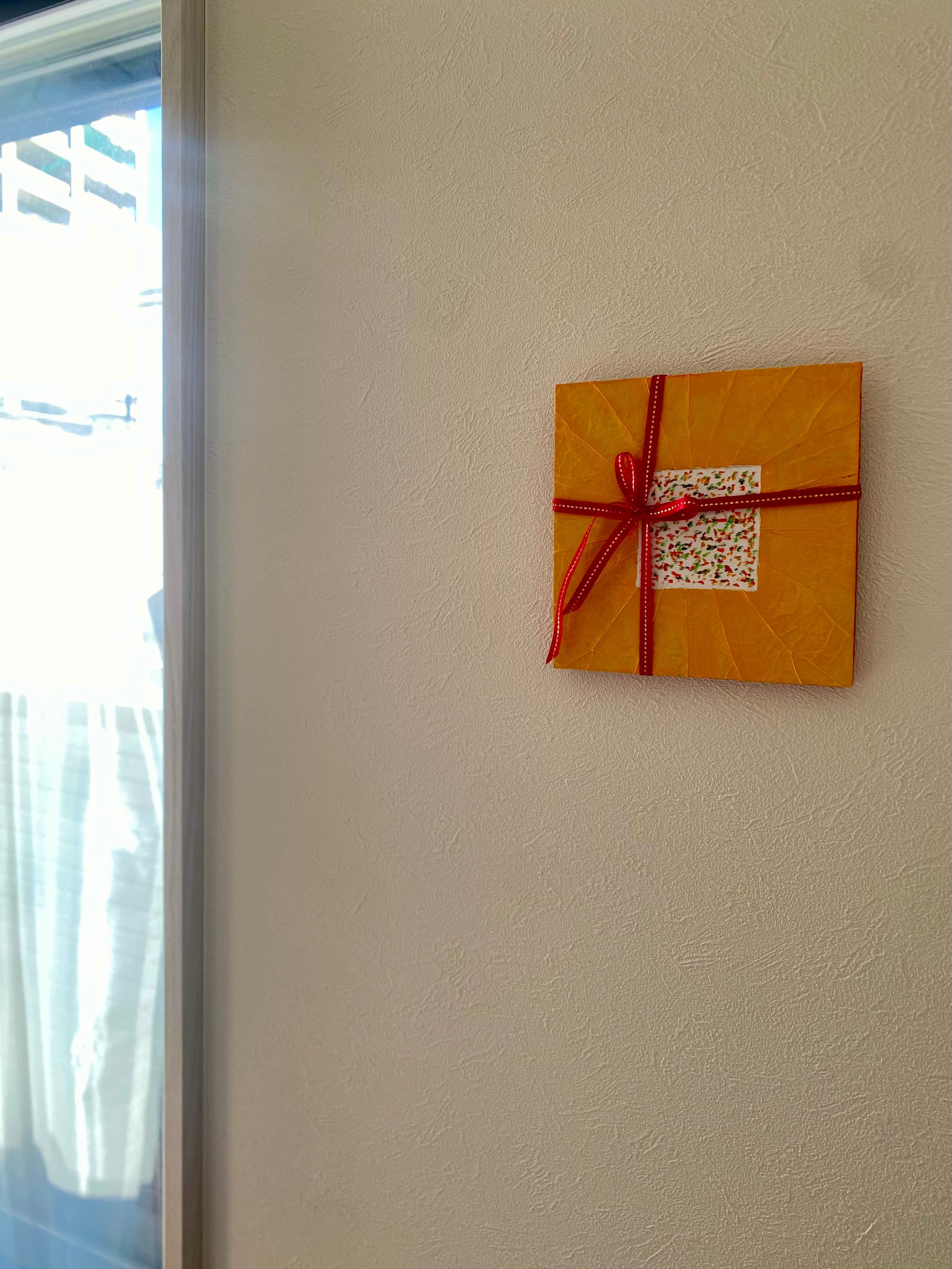 プレゼントボックスに見立てた、天然の蓮の葉を貼ったインテリアパネルです。