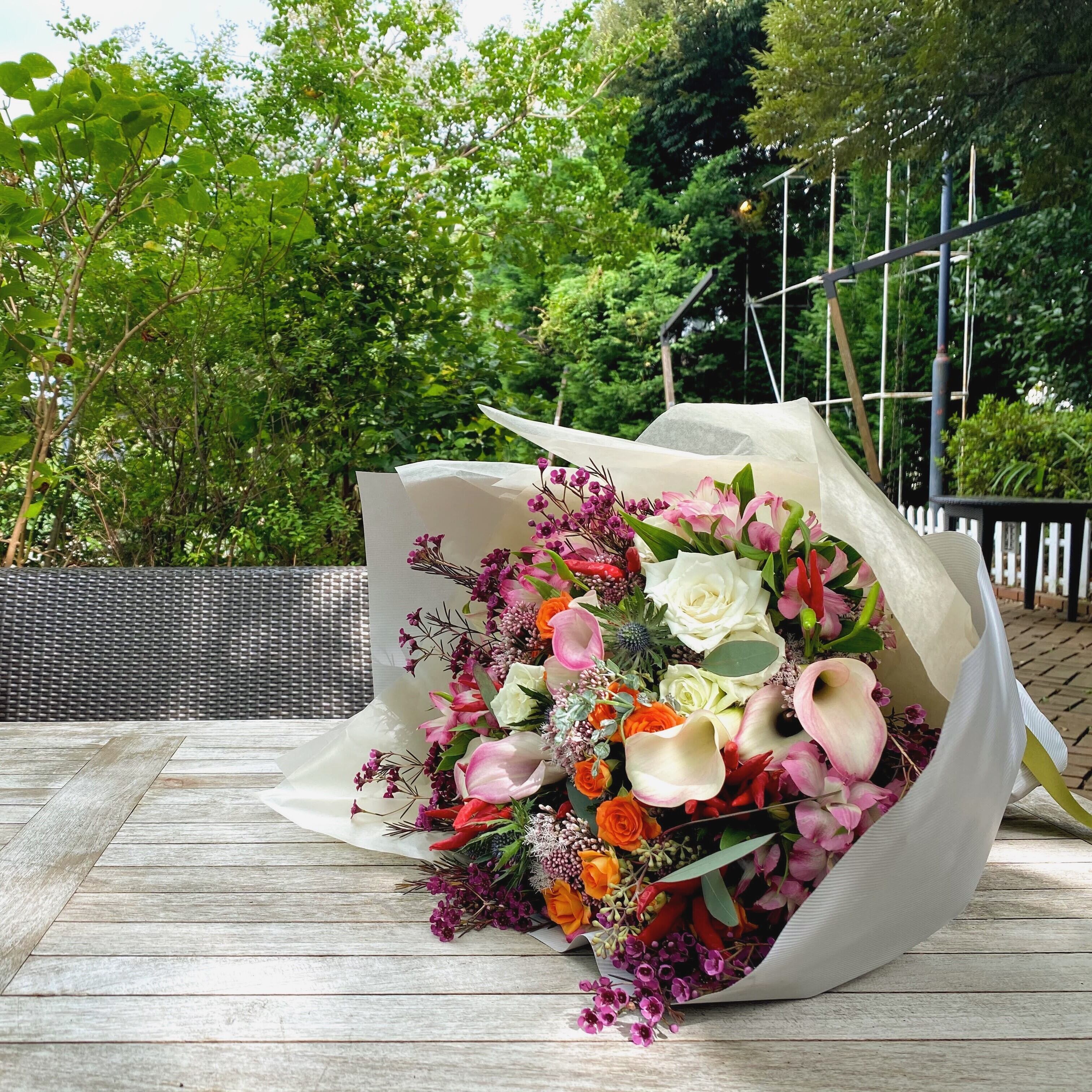 オーダーに合わせて市場に買い付けに行き、その時々で出会ったお花をセレクトしておりますので、写真のお花はイメージとなります!