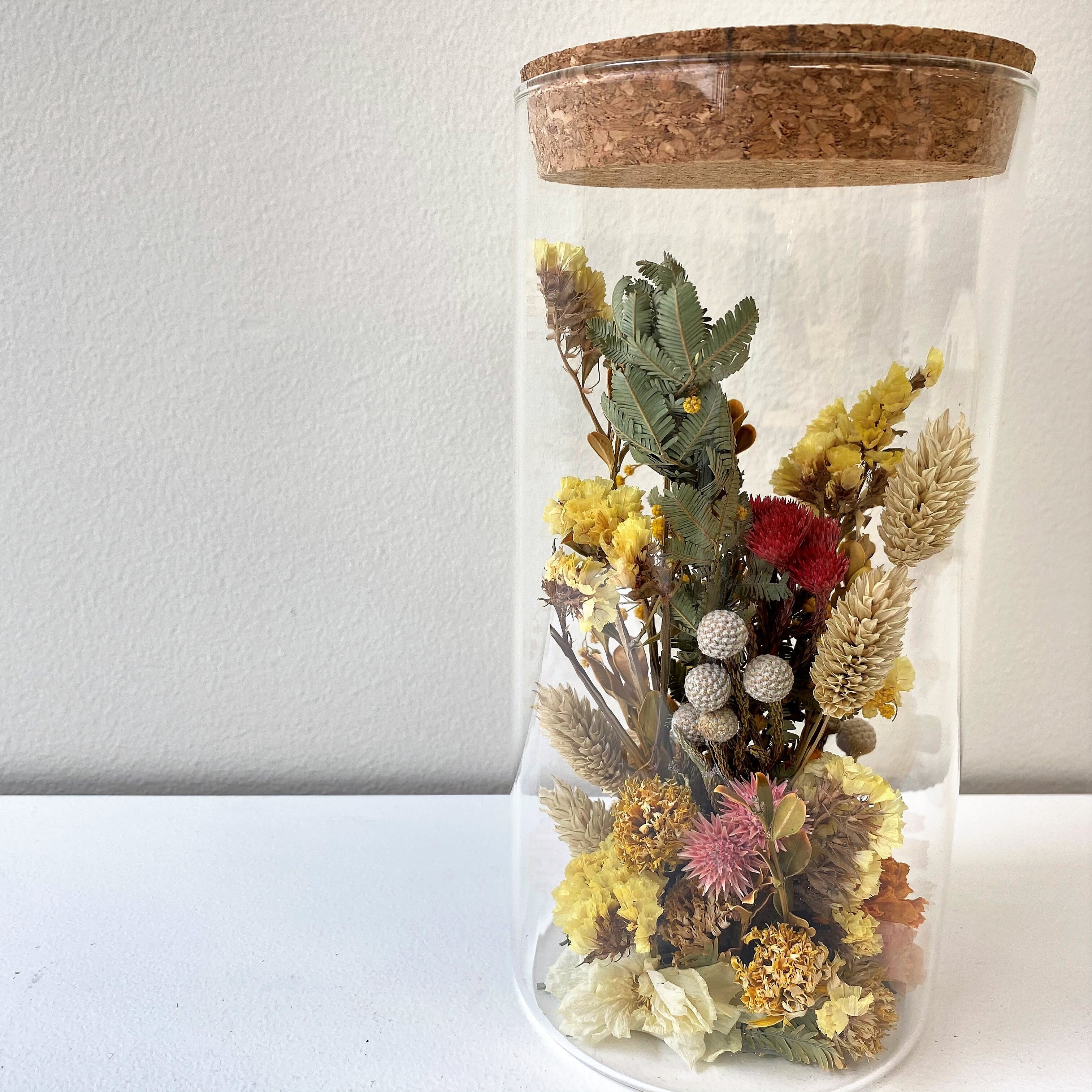 すっきりとした円柱ボトルの中にドライフラワーがギュッと詰まった、お手入れいらずのスペース要らず!